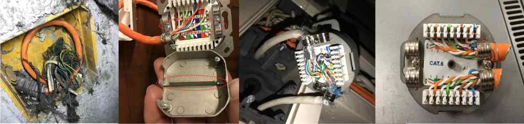 2. Bild: Das Verlegekabel wurde über die Mitte der Dose gelegt, dadurch wurde die Isolierung durch den Trennsteg in der Mitte durchtrennt und ein Kurzschluss erzeugt. Verdrillung und Paarschirmung ist ebenfalls nicht vorhanden.